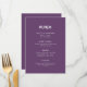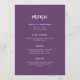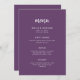 This elegant, minimalist wedding menu card features modern script typography and clean, sans serif text for a simple and stylish cassis purple and white design you will love.