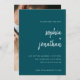 These elegant, minimalist wedding save the date cards feature white, modern script typography and clean, sans serif text on a deep teal background, with your favourite personal photo on the back.
