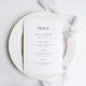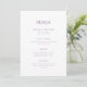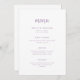 This elegant, minimalist wedding menu card features modern lavender coloured script typography and clean, sans serif text on a white background for a simple and stylish design you will love.