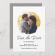 Modern minimalist Wedding Save the Date announcement card with a simple script design. With customisable lettering, you add your names, and wedding details. You also add your own photo to add a touch of personalisation. The back has a neutral grey colour to add contrast. Great for adding a boho touch announcement for planning your special day.