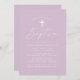 The simple baptism invitations feature a casual white calligraphy script with a light purple background for a design that is perfect for a modern baby baptism. Personalise the elegant baptism invitations with your child's name and religious event details below. The back of the purple baptism invitation provides space for additional text and photos.