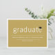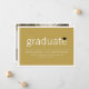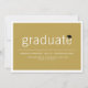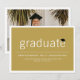 A modern minimalist graduation announcement photo card design featuring simple bold typography with a mortar board / graduation cap accent on a flat gold colour background layer which can be personalised and changed to any custom colour of your choice. The back photo can be removed to add your own custom text.