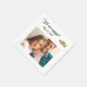 A modern and simplistic napkin with a personalised photo of a couple and the customisable text "We are engaged" and the engagement date. There are also two wedding rings.