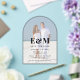 Arch-shaped acrylic save the date wedding announcement that features your photo overlayed with your monogram initials in large elegant serif typography. Customise your save the date details in modern lettering.