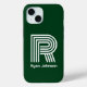 This modern monogram green iphone 15 case is trendy yet and classic. It features your first or last initial in a bold trendy font and your name in a coordinating classic font in white. It's simple and minimal.
