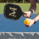 Modern personalised custom colour pickleball paddle featuring a monogram and name shown in an editable fancy handwritten script name in customisable black, gold and white colours for the pickler or pickleball player. COLOR CHANGES: Change the text or background colours or add a styled graphics background by clicking on the EDIT tab in the PERSONALIZE section to create your own custom design. PADDLE OPTIONS: Choose from Black, Tan or White edging and grip colours on the ordering page. ASSISTANCE: For help with design modification or personalisation, colour change, transferring the design to another product or if you would like coordinating items, contact the designer BEFORE ORDERING via the Zazzle Chat MESSAGE tab below or email makeitaboutyoustore@gmail.com.