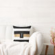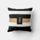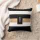 Modern black, white and gold tone accent throw pillow with a bold horizontal striped pattern. A black and gold tone decorative plaque, has a custom white one letter monogram. Personalise the letter to suit your needs. Matching home decor is available.