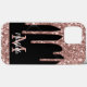 Elegant, modern, girly blush rose gold glitter drips custom personalised name and monogrammed iphone case. This design features pink rose gold colour glitter sparkle drips on black background with custom personalised monogram initial and first name text template. Perfect feminine gift for girl and women who loves pretty trendy glam things. If you need help or matching items, please contact to me.