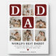 Create your very own DAD plaque with this modern multi-photo grid collage and text. Design features 6 Photographs with curved corner squares with the text DAD in burgandy blocks that can be changed to any colour. The text 'World's Best Daddy' with a cute father quote that can be kept or customised to make it personal to you! and a cute little heart with the kids name/s. PHOTO TIP: Crop and centre your pictures before uploading for best results.