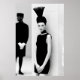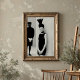 Elevate your space with this captivating black and white art print, a masterful fusion of high fashion and artistic minimalism. The central figure, a modern muse, commands attention with her impeccable style: a striking black sleeveless dress, a sleek choker, and an extraordinary, avant-garde spiky headpiece that reaches towards the sky. Her pale, almost porcelain-like skin and dramatic eye makeup create an unforgettable visual impact. In the softly blurred background, a mysterious male figure in a tall hat and dark attire adds depth and intrigue to the scene. Rendered in stunning high-contrast black and white, this piece emphasises form, texture, and sophisticated silhouettes against a pristine white backdrop. Ideal for contemporary homes, fashion studios, or any space desiring a touch of dramatic elegance, this print is perfect for those who appreciate bold artistic statements and timeless chic.
