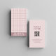 Business card design with a muted purple chequered pattern in a minimal layout, featuring a QR code for easy access to a website or portfolio. Suitable for handmade clothing brands, small businesses, or creative professionals.