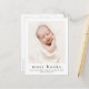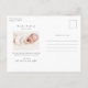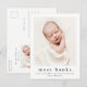 A sweet photo birth announcement featuring modern name and a large horizontal photo on the front. The back has an additional photo spot with a large full name header and personal message from the family. The back is also a mailable postcard. Click the edit button to customise this design with your photos and details.