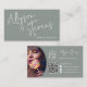 A modern and bold simple makeup artist and hair stylist business card featuring oversized name at the front in a handwritten style font and photo, qr code and social media at the back on sage green. All the colours are editable.