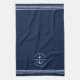 Nautical boating kitchen towel in navy blue reading "welcome aboard" as well as your custom boat name and location within an anchor design.