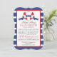 Modern red, white & blue nautical baby shower invitation for a baby boy shower. Our Ships Ahoy contemporary boy baby shower invitation features a red & white stripe heart Buoy with a blue banner with the word boy on it. The background is a bold & bright blue and white horizontal stripe. Flip the invitation over for a matching stripe back. Visit our shop to view this for a girls baby shower and a gender neutral baby shower.