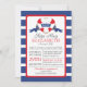 Modern red, white & blue nautical baby shower invitation for a gender neutral shower. Our Ships Ahoy contemporary boy or girl baby shower invitation features a red & white stripe heart Buoy with a blue banner with the word baby on it. The background is a bold & bright blue and white horizontal stripe. Flip the invitation over for a matching stripe back. Visit our shop to view this for a girls baby shower and a boys baby shower.