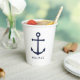 Modern Minimalist Nautical Paper Cups featuring navy blue anchor with personalised name in navy blue modern sans serif font style.