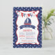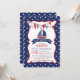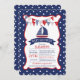 Modern scallop die cut baby shower invitation featuring a blue & red stripe and polka dots sailboat set on a blue background with white polka dots. Our sweet shower design also features a modern baby bunting pendent with polka dots and anchor. Flip our cute summer baby shower invitation over to view a matching back for an extra special touch. Stylish & fun tropical boat baby shower invitation for a baby boy baby shower, gender neutral baby shower or a girls baby shower.