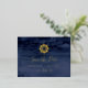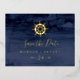 This modern nautical ship helm gold foil save the date foil invitation postcard is perfect for a cruise or beach wedding. The simple design features a gold foil boat wheel on a navy blue watercolor background with luxurious pressed gold foil typography.