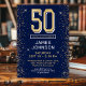This fabulous navy blue and gold men's 50th birthday party invitation featuring the number 50 in gold with modern fonts and gold glitter sides on the front and a fabulous photo on the back would be perfect for asking people to join you as you celebrate the man in your life's 50th birthday. It is traditional and classic while being fresh, modern and contemporary. To see your unique invitations select "Personalise this template" and type in your information. It's super easy!
