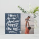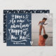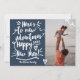 Here's to new adventures! Happy New Year 2022! In a modern fun hand lettered script calligraphy, add your photo , in dark navy blue color.