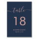 Minimalist, yet elegant navy blue and blush wedding table number card featuring a modern script font. Matching items available.