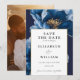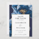 This elegant navy blue and gold floral wedding save the date can be personalised with your information in modern typography and a special photo on the reverse. Designed by Thisisnotme©