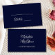 Guide your guests to their seats in style with this elegant wedding place card. The minimalist design features a sophisticated navy blue background with beautiful silver script lettering for the couple's names and wedding date. The card also includes a section for the guest's name and table number, making it a perfect addition to a modern or classic wedding reception. Its clean, two-sided design and stunning colour combination make it a memorable detail for your special day.