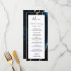 This elegant, modern wedding menu features a watercolor navy blue agate background trimmed with gold faux glitter. The text appears in elegant charcoal gray handwriting and copperplate fonts on a white rectangle. The agate design is repeated on the reverse.