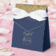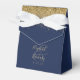 The front flap of this elegant modern wedding favour box features a gold faux glitter border. The customisable text combines gold-coloured handwriting and copperplate fonts over a large ampersand on a navy blue background.