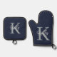 Modern Navy Blue Monogram Script Oven Mitt & Pot Holder Set