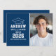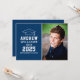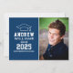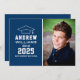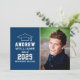 Announce your high school or college graduate in style with this graduation announcement and party invitation. Two-sided card features a senior portrait of the graduate with grad cap and simple and modern white typography design. Navy blue background can be changed to a different colour with the "Customise It" feature, then Edit / Background to select another colour.