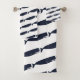 Modern navy blue whale silhouettes pattern over white. These towels make a great addition to a nautical bathroom!