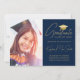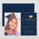 Send your family and friends a unique personalized photo college graduation card to wow them. This template design features your custom photo on the left and to the right a white grad cap sitting on the word "Graduate" written in a hand lettered faux gold script typography. Personalize your class/year, name, degree and other ceremony details on a classic navy blue background. Designed by Susan Coffey.