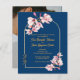 Elegant double-sided wedding invitation featuring blush pink magnolia florals on a rich navy blue background with a luxurious gold arch frame on the front, and a customizable photo back for a personal touch. Perfect for classic, modern, and romantic weddings. Personalize with names, date, venue details, and your favorite engagement photo. Ideal for fall, winter, and evening weddings. Matching Save the Date, RSVP, details cards, and full wedding stationery suite available.