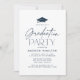 Modern graduation party invitations featuring a black graduation cap at the top of the design with "Graduation Party" displayed in navy script typography on a white background. Personalise the minimalist graduation party invitation with the graduate's name and party details. The navy graduation party invite is perfect for celebrating both high school and college graduates.