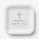 Modern Navy Script Religious Cross Boy Baptism Paper Plate