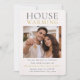 Modern new home design featuring neutral blush tones, bold serif typography, and a centered photo layout with gold accent text. Clean, photo-forward style suited for announcing a move and inviting guests to a housewarming gathering with a polished, contemporary look.