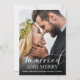 Christmas modern married and merry full wedding photo card. On the back of the card is dark grey with a light grey polka dot pattern.