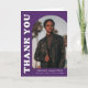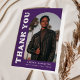 Stylish and trendy graduation thank you card featuring the graduate's photo on the front with an offset arch photo frame. "Thank You" is displayed in bold white retro lettering on a purple background. Personalize the front of the arch photo graduation thank you card by adding the graduate's name, school, and graduation year. The inside of the card provides space for your typed or handwritten message. The back of the purple graduation thank you card features a 3-photo collage.