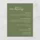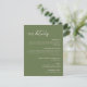 A modern and elegant olive green wedding details card, featuring customisable reception, accommodation, rsvp and wedding website details.