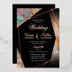 A modern wedding invitation with an elegant geometric frame in shimmery rose gold foil. The main colour theme is black with opal and faux glitter accents. Rose gold foil adorns the main details and the geometric frame with the rest of the text white. Calligraphy script adds a touch of glamour and luxury.