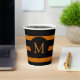 This stylish design features orange and black horizontal stripes with a round black centre monogram and the letter in an orange block font for October holiday parties.