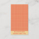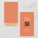 Business card design with an orange chequered pattern in a clean, minimal layout, featuring a QR code for easy access to a website or portfolio. Suitable for handmade clothing brands, boutique shops, or creative professionals.