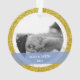 Splashy yet elegant Our First Christmas Engaged personalised photo Xmas ornament for recently engaged couples, with modern cursive typography / hand lettering on a stylish semitransparent blue band, a frame of white and silver snowflakes and little stars, and another frame of simulated golden glitter. Make sure you personalise at least the two photos (front and back), and the first names and the year on the back.