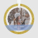 Splashy yet elegant Our First Christmas Together personalised photo Xmas ornament for recent couples, with modern cursive typography / hand lettering on a stylish semitransparent blue band, a frame of white and silver snowflakes and little stars, and another frame of simulated golden glitter. Make sure you personalise at least the two photos (front and back), and the first names and the year on the back.