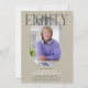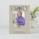 Modern stylish 80th Birthday Invitation. Design features an oval photograph of the birthday girl/boy, the elegant lettering 'EIGHTY' with the persons name in signature script over the top and a simple birthday party template that is easy to customise with your own details. The colours can also be changed to match your own party decor.
