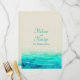 Beautiful blue green painted sea with graphic waves sparkle overlay wedding dinner menu. A beautiful beach, coastal ocean inspired, contemporary, wedding menu featuring a unique stylised, hand watercolor sea, on a sand colour paper. Perfect for a modern beach wedding. Edit this dining menu with your own words. Unique designed and painted by Sarah Trett.