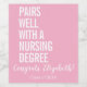 Cheers to you, nursing graduate! We’re celebrating your remarkable achievement with a special bottle of wine adorned with a personalised, funny label. The design features a blush pink background with bold white text that reads, "Pairs Well With a Nursing Degree." Below, "Congrats, [Name]!" is elegantly scripted in calligraphy, and "Class of 2024" is displayed in sleek, white block letters at the bottom. This customisable label lets you adjust the design to perfectly match the occasion. Celebrate their outstanding success with this unique and memorable wine label!