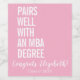 Cheers to you, MBA graduate! We’re raising a glass in celebration of your incredible achievement with a special bottle of wine featuring a personalised, humourous label. The design showcases a blush pink background with bold white text that says "Pairs Well With An MBA Degree." Below that, "Congrats, [Name]!" is elegantly scripted in calligraphy, and "Class of 2024" is displayed in sleek, white block letters at the bottom. This customisable label template allows you to tailor the design to your liking. Celebrate their remarkable accomplishment with this fun and memorable wine label!